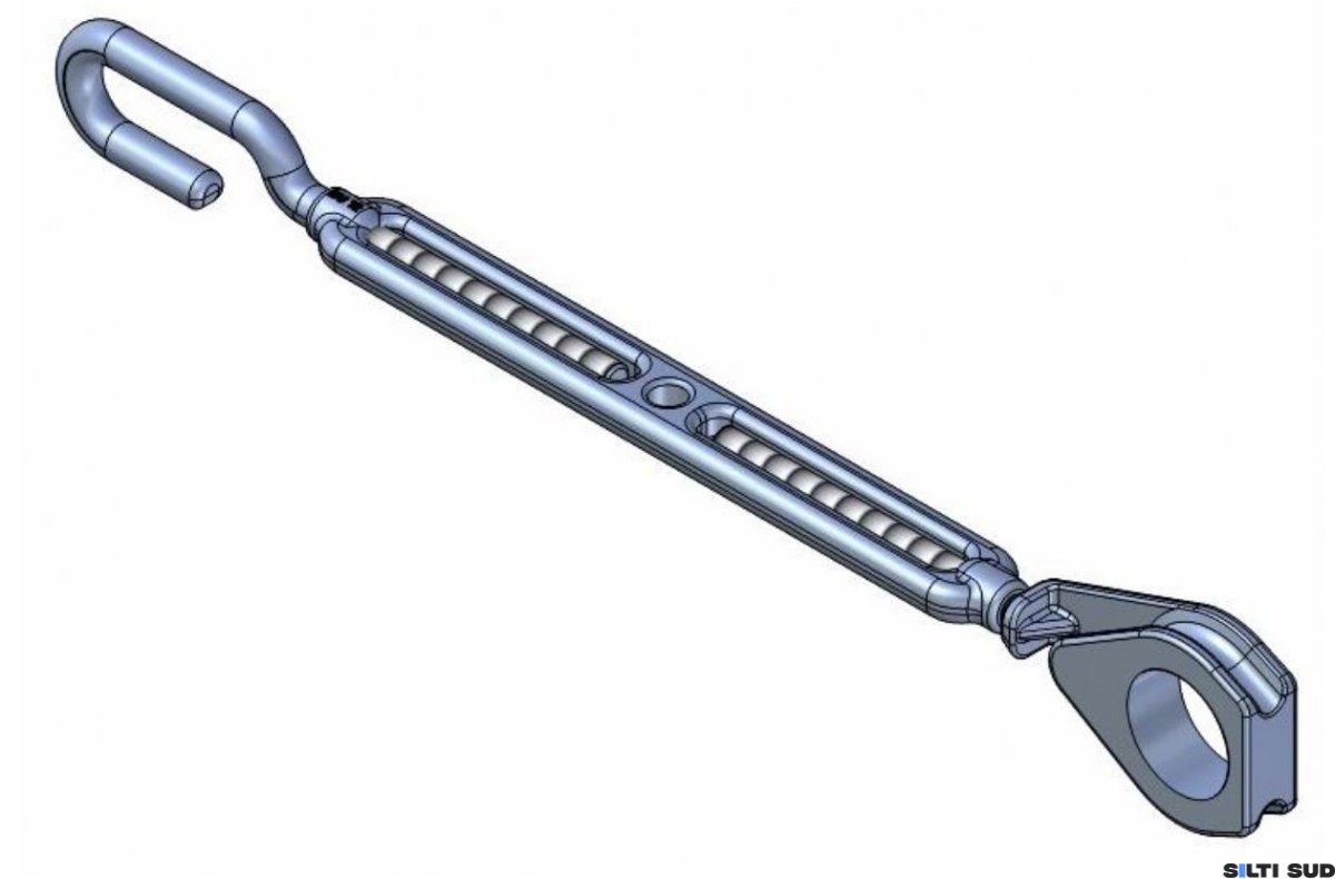 Le tendeur se compose d’un corps fileté sur lequel sont vissés deux éléments : le crochet de fixation au collier du poteau et la cosse pour le passage du collier de serrage.